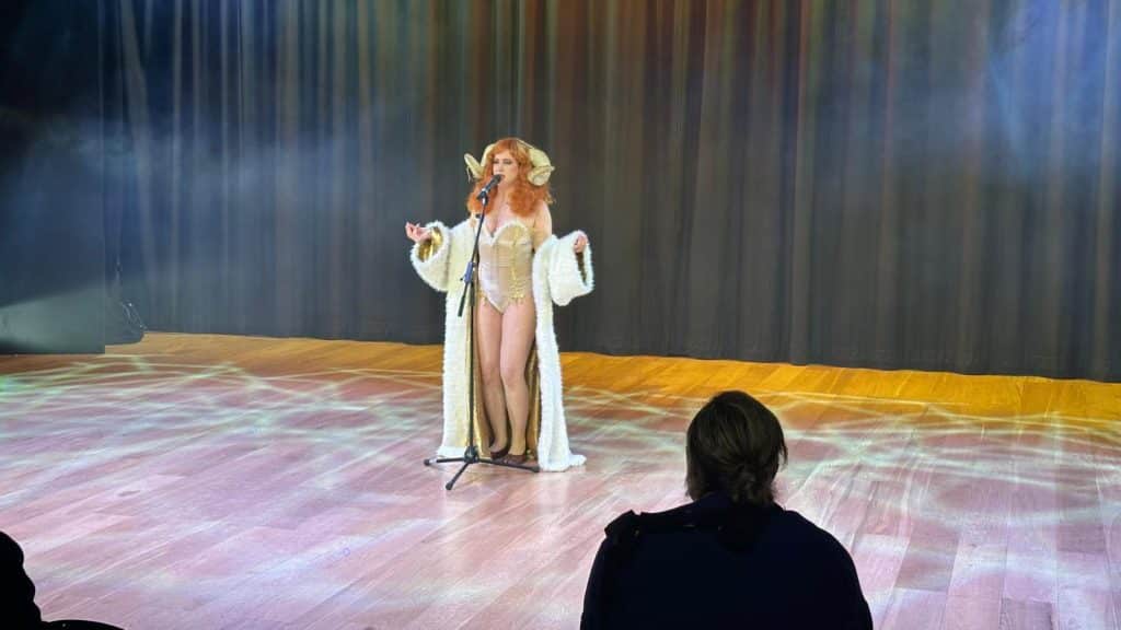 From the outset, Fleur set the tone for the night. She chatted effortlessly with the audience, asking who among us were burlesque virgins and who were seasoned veterans, before laying out the only real rule of burlesque. Quite simply, “don’t be a dick”. It was funny, disarming, and warmly inclusive, creating an atmosphere where everyone felt part of the show rather than just spectators.