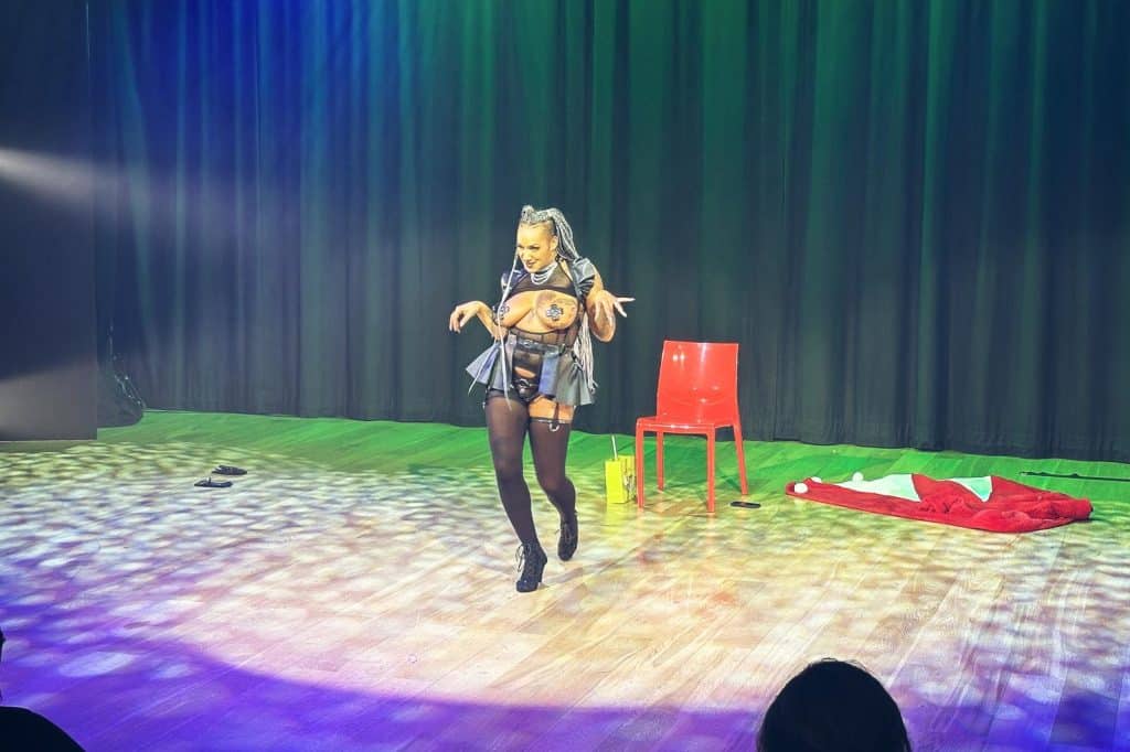 The final act brought the evening to a festive climax. Jada Love returned with a Christmas-themed routine that saw Santa on the phone and temptation taking over. Red robes fell away to reveal black lingerie, long braids, whips, and playful domination. It was cheeky, theatrical, and ended the night on a euphoric high.