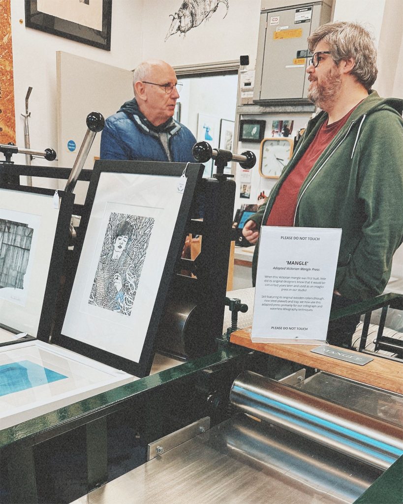 Downstairs, the print rooms were buzzing. One of the rooms housed a large and well-loved Intaglio press – still the most used in the studio – alongside printed tote bags, notebooks and other handmade items available to purchase. It’s the kind of place where you can find something unique and bespoke, all while supporting local artists directly.