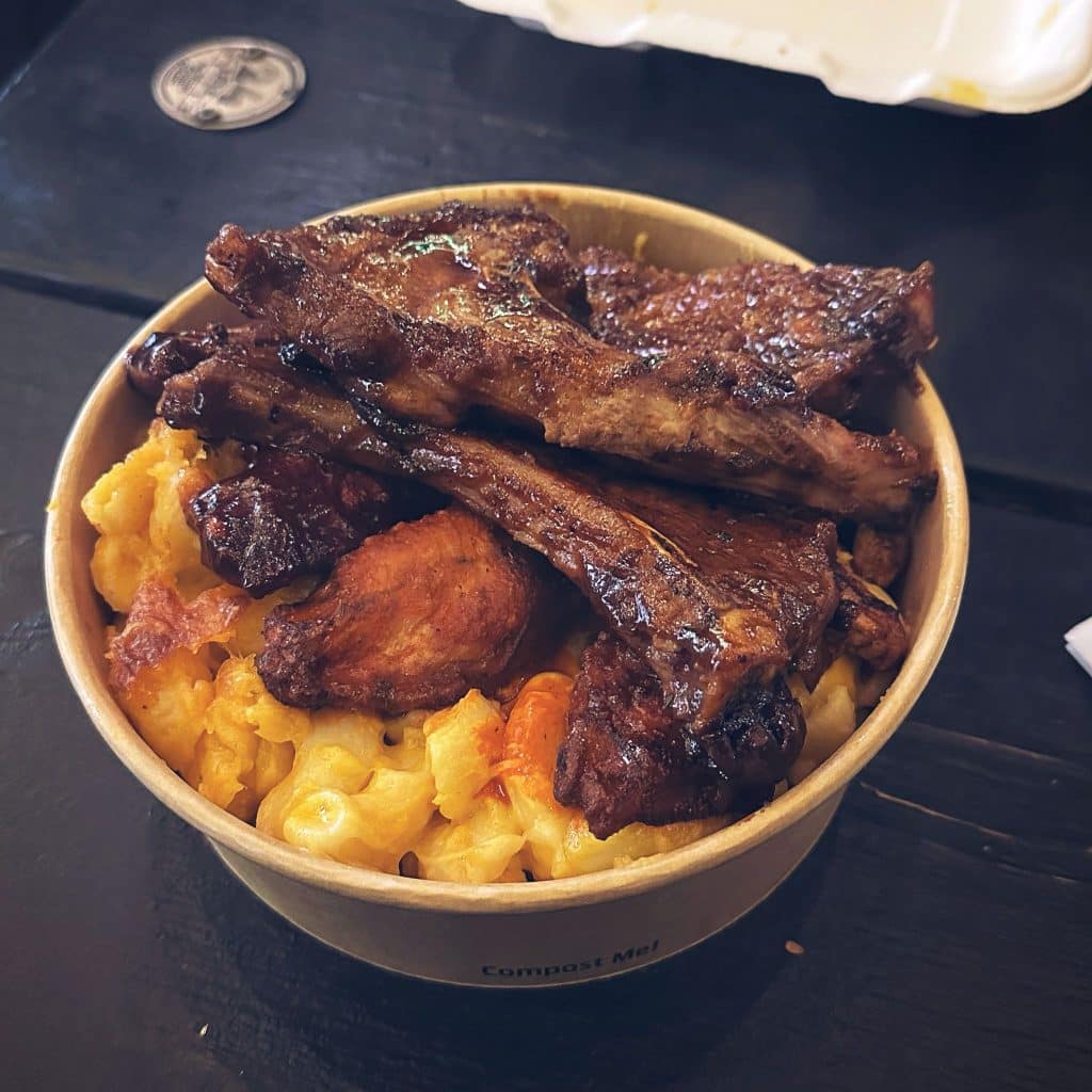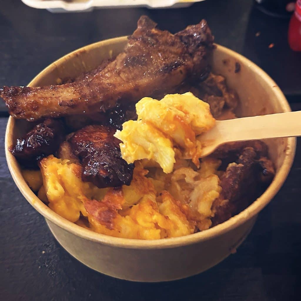 I went straight for the Mini Munch at £18, and let me tell you, there is absolutely nothing mini about it. This is a feast. A mountain of creamy, cheesy, unapologetically indulgent mac and cheese forms the base of the box, and it’s the kind of mac that hits you instantly with that buttery, velvety richness. It’s proper soul food.