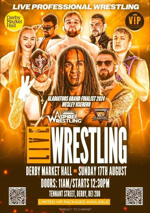 Aspire Wrestling Alliance brings a thunderous live wrestling show to Derby Market Hall on Sunday, August 17, delivering over two hours of pulse-pounding action featuring the explosive energy of local talents alongside GLADIATORS finalist Wesley Nsereko in a show designed to electrify the city, free for general admission while VIP ringside seats have already vanished, yet anticipation surges in every corner of the venue, offering fans a chance to jeer the villains, rally behind their favourites, and become part of the drama unfolding under lights and cheers