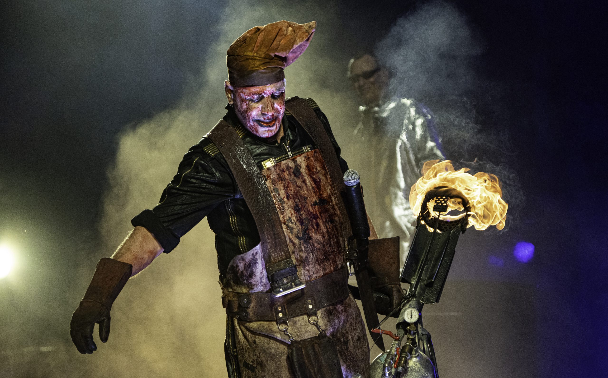 The early tours taught a generational lesson that other heavy acts spent decades learning, that in an era of infinite audio the real scarcity is heat, light and risk. Rammstein answered with a stage show that treats fire as choreography and architecture as costume. Ladders descend, catwalks rise, steel mesh glows, masks belch jets and drummer towers appear like scaffolds for some brutalist opera. Till Lindemann did not just sing through fire, he trained as a pyrotechnician so the band could escalate safely, strapping flame hardware to his body, walking in a jacket that smolders like a foundry apron and wearing a face mounted flamethrower that turns the frontman into a furnace. The result is a ritual that feels engineered to be felt in the sternum, an event where heat licks the terraces and smoke curls under a roof until the stadium itself seems to exhale. Critics who dismissed the band as shock merchants learned the hard way that the shock is only the fuse, the detonation is musical, the event is cohesive and the audience leaves with powder in the hair and choruses in the throat.