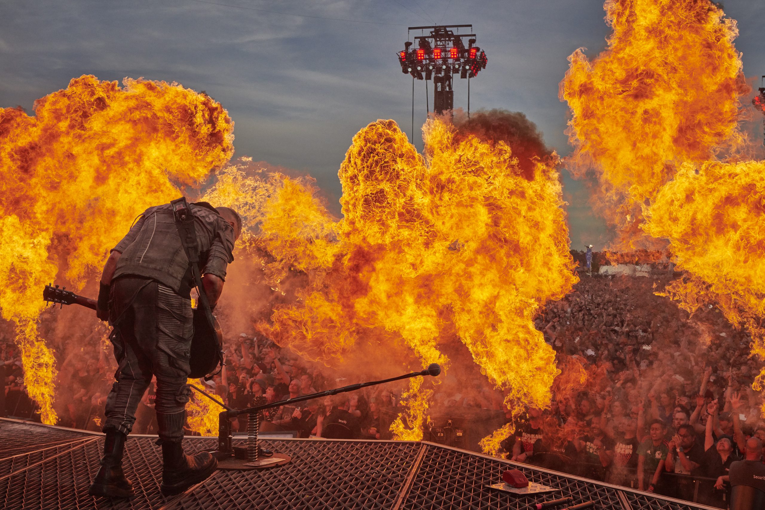 Pyrotechnics at this scale are not garnish, they are grammar. The face rig that spits ribbons of flame, the back mounted jets that turn a human silhouette into a welders angel, the giant cauldrons that bloom over the drum riser and the sudden sheets of heat that ripple through the bowl, all of it is plotted with the logic of narrative beats. The band learned the hard lessons early, accidents taught respect, certification tempered bravado, and the choreography evolved until the risk felt intentional rather than reckless. These are not fireworks that decorate a chorus, they are sentences, commas and crescendos in a language that the audience understands intuitively. Other acts bought bigger cannons or added more confetti, Rammstein added system thinking, ensuring that the show scales from arenas to airfields without losing coherence, ensuring that the fire is not a stunt but a dramaturgical spine that holds the whole beast upright.